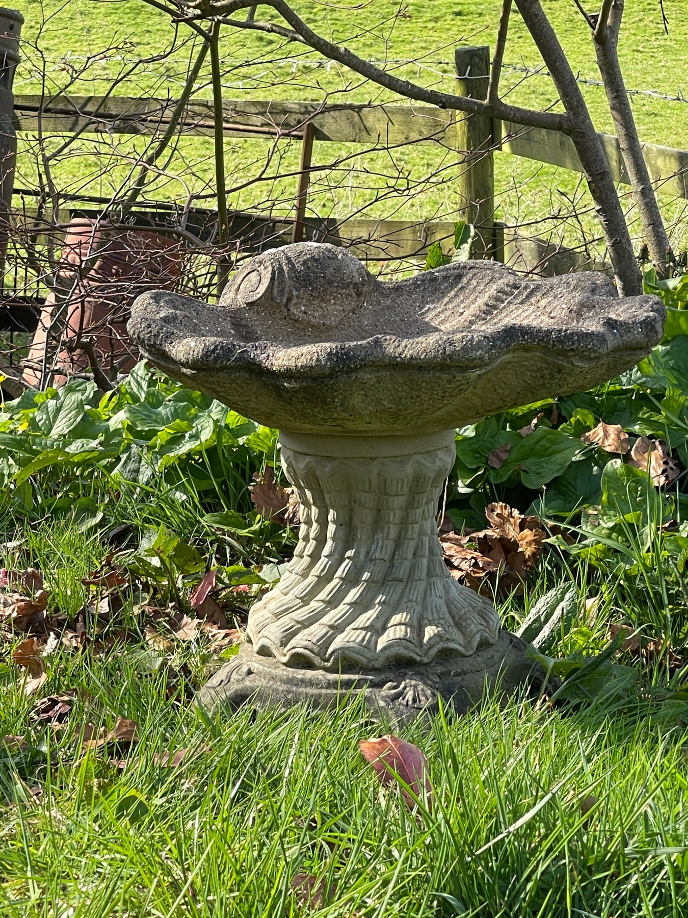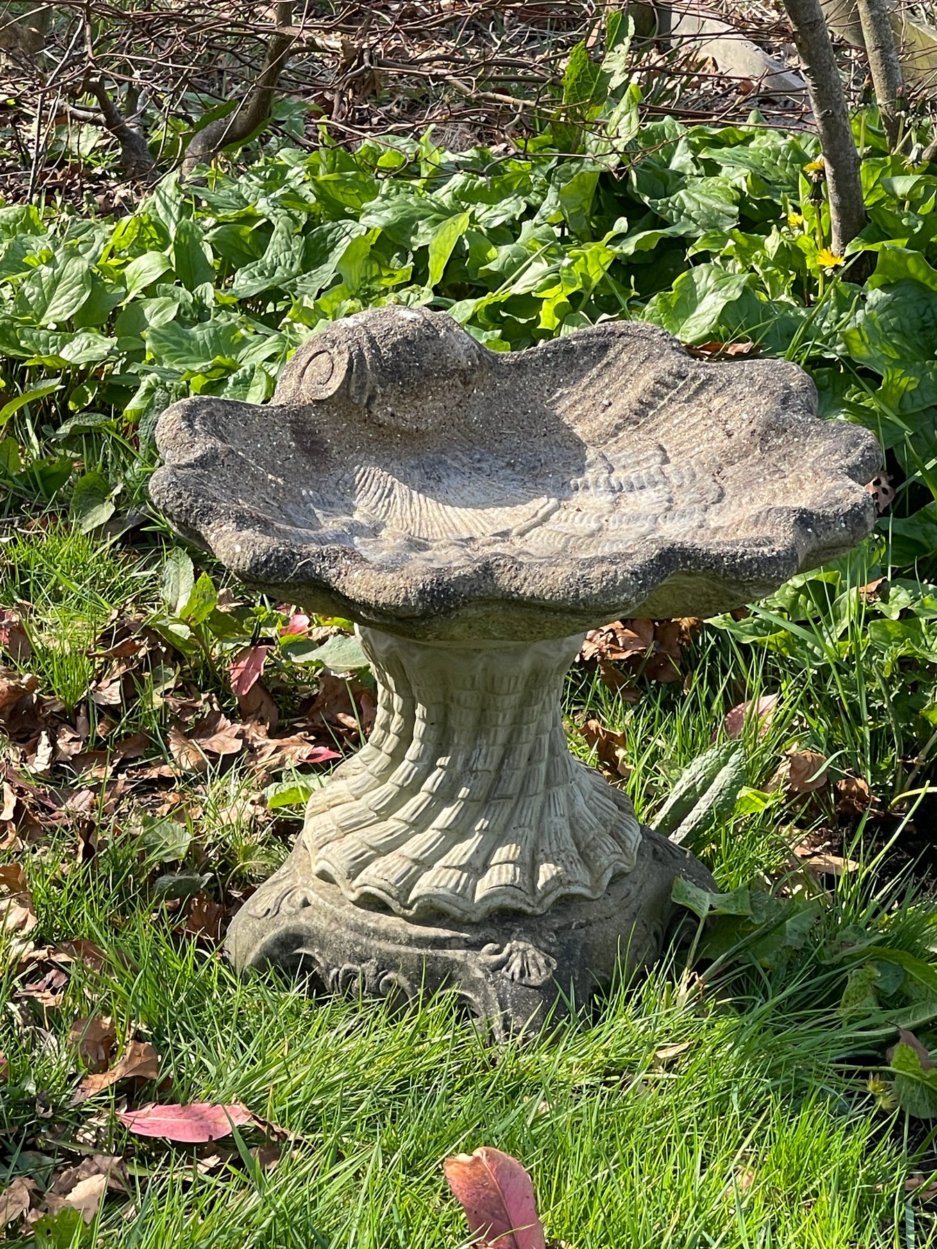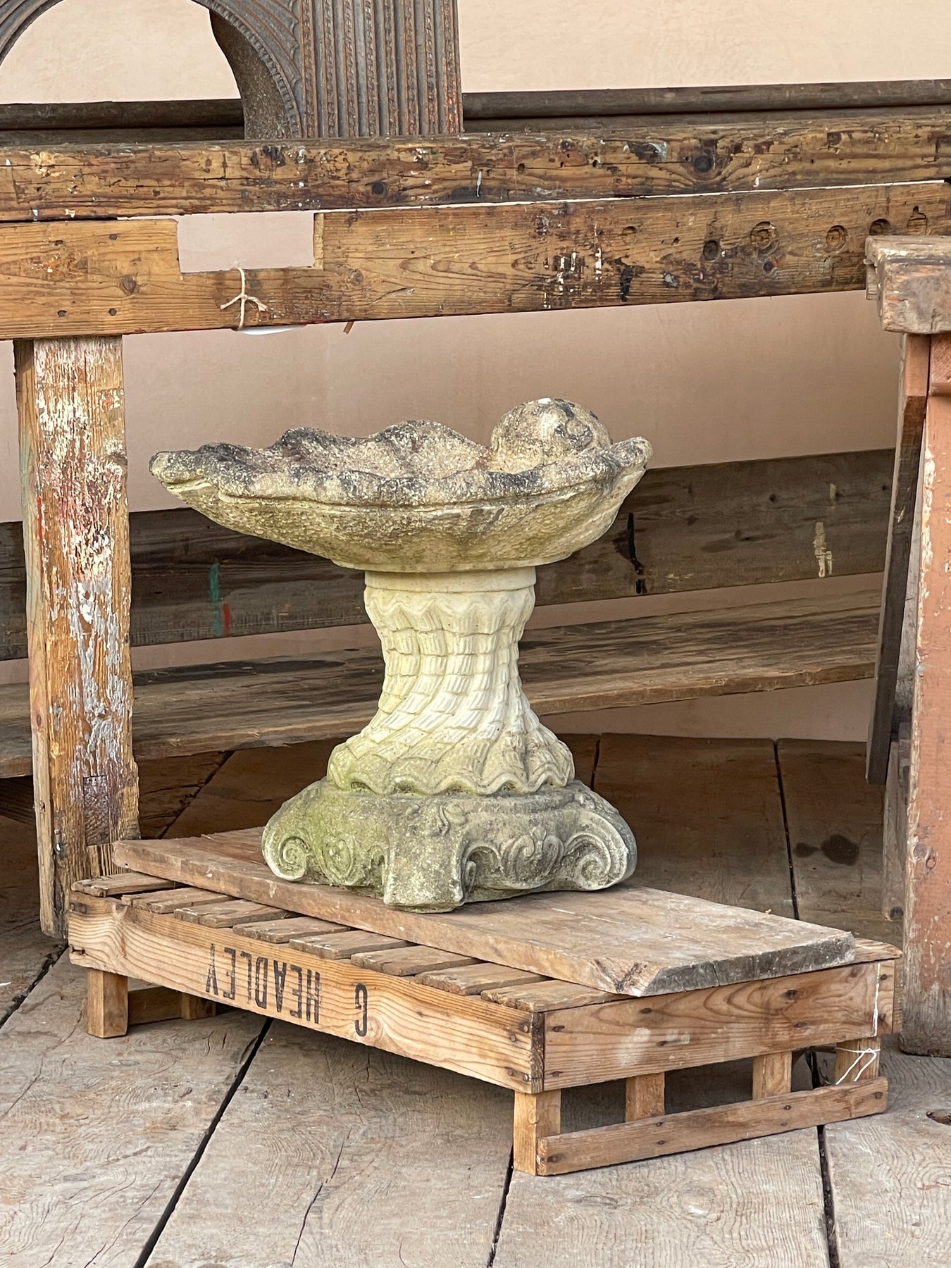 Nicely weathered birdbath.