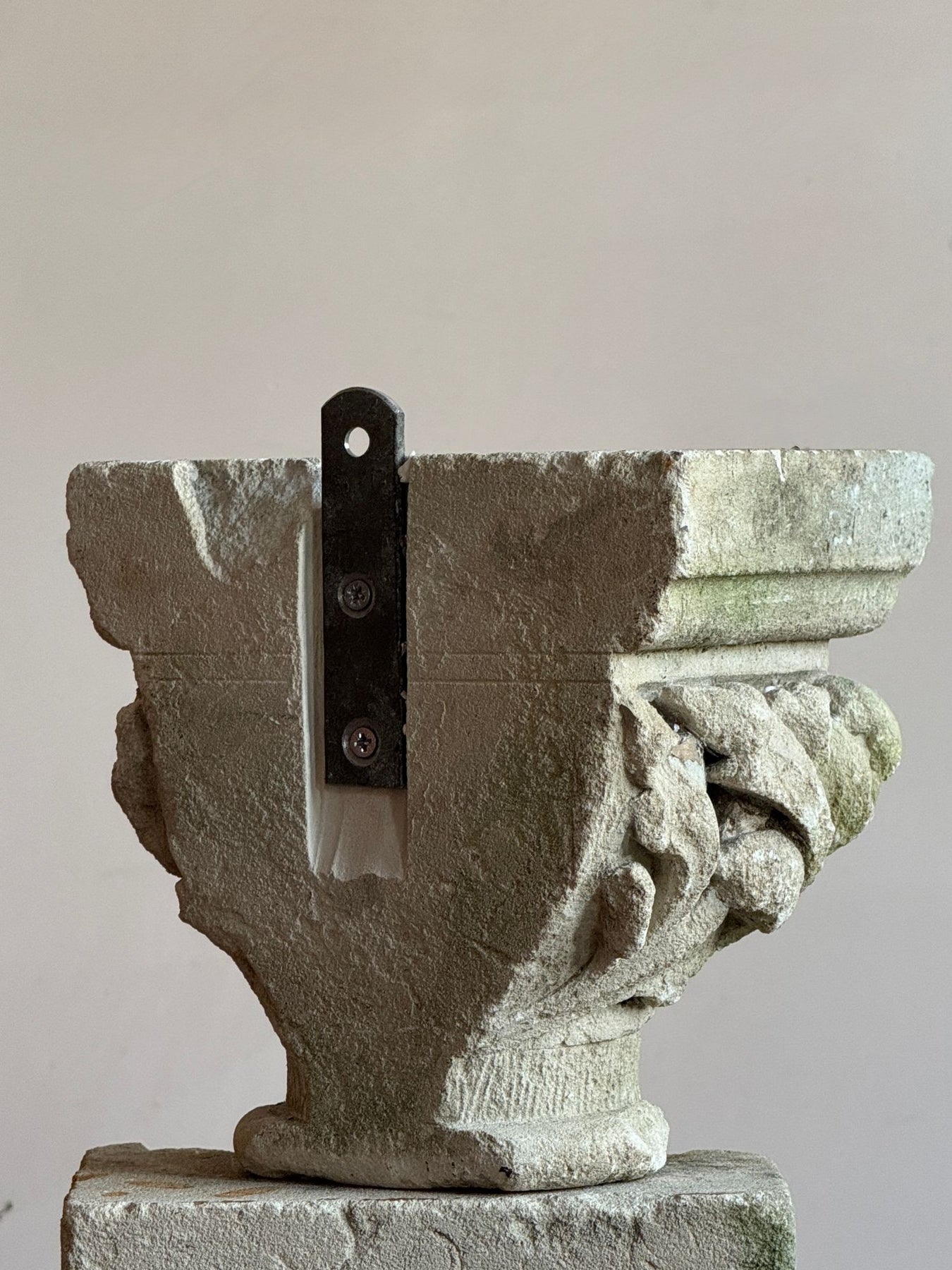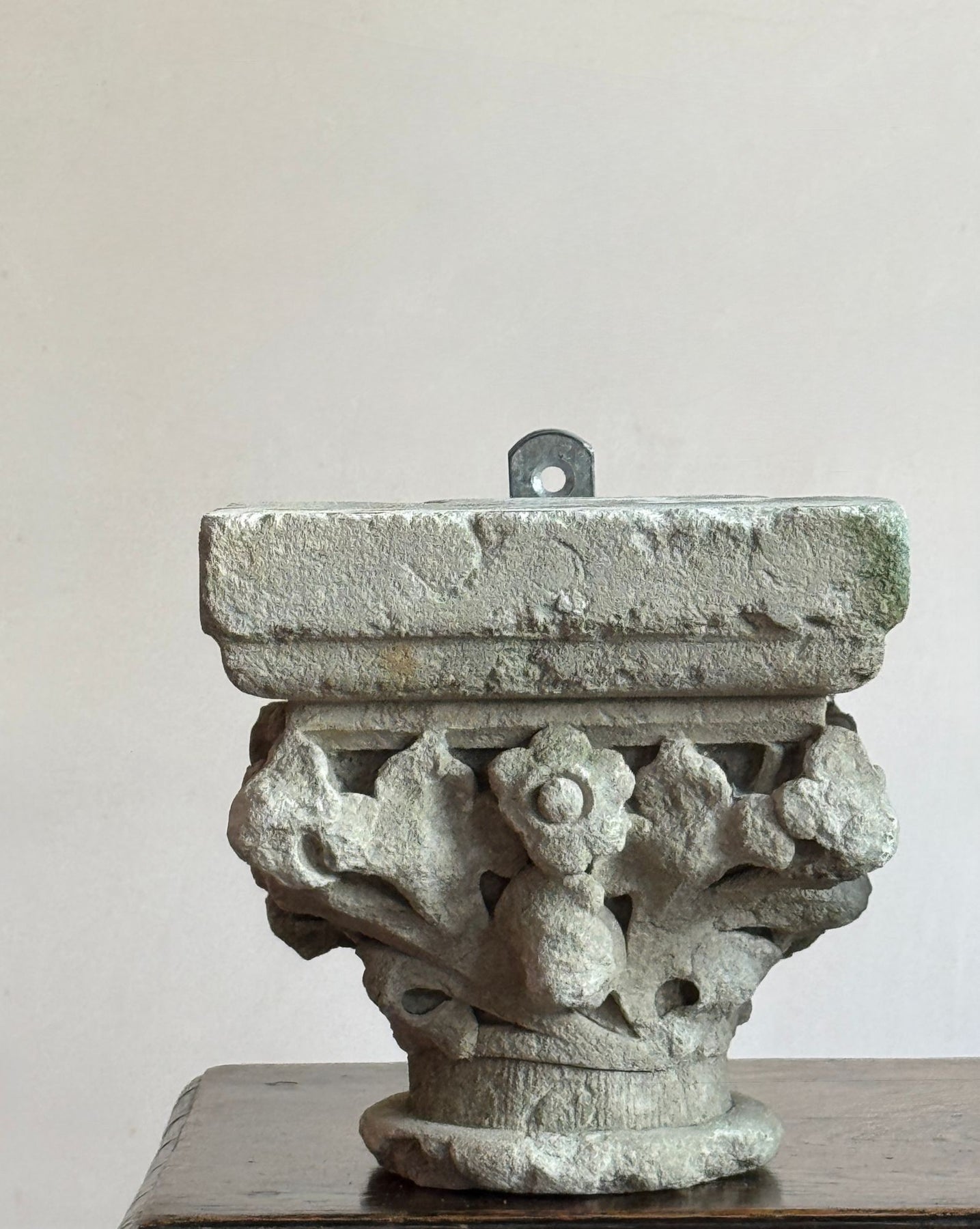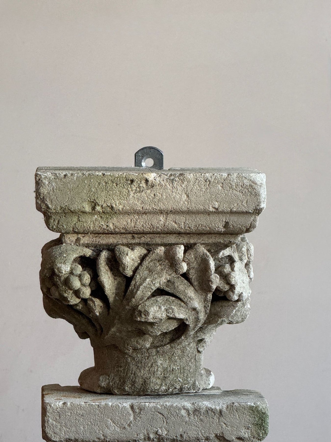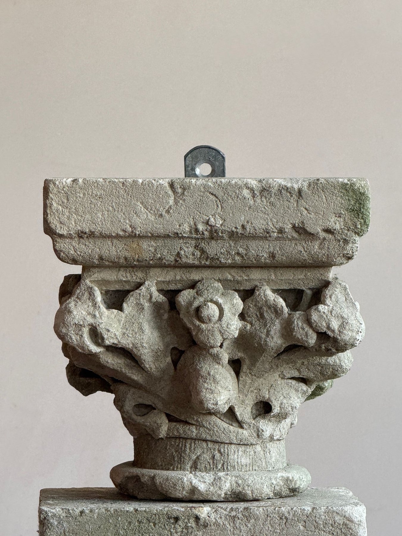 A pair of early carved limestone capitals, the Calathus and Helices formed by foliage, berries and flowers. Likely from an ecclesiastical setting.