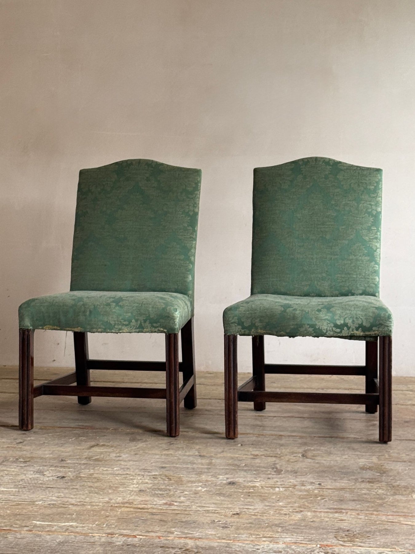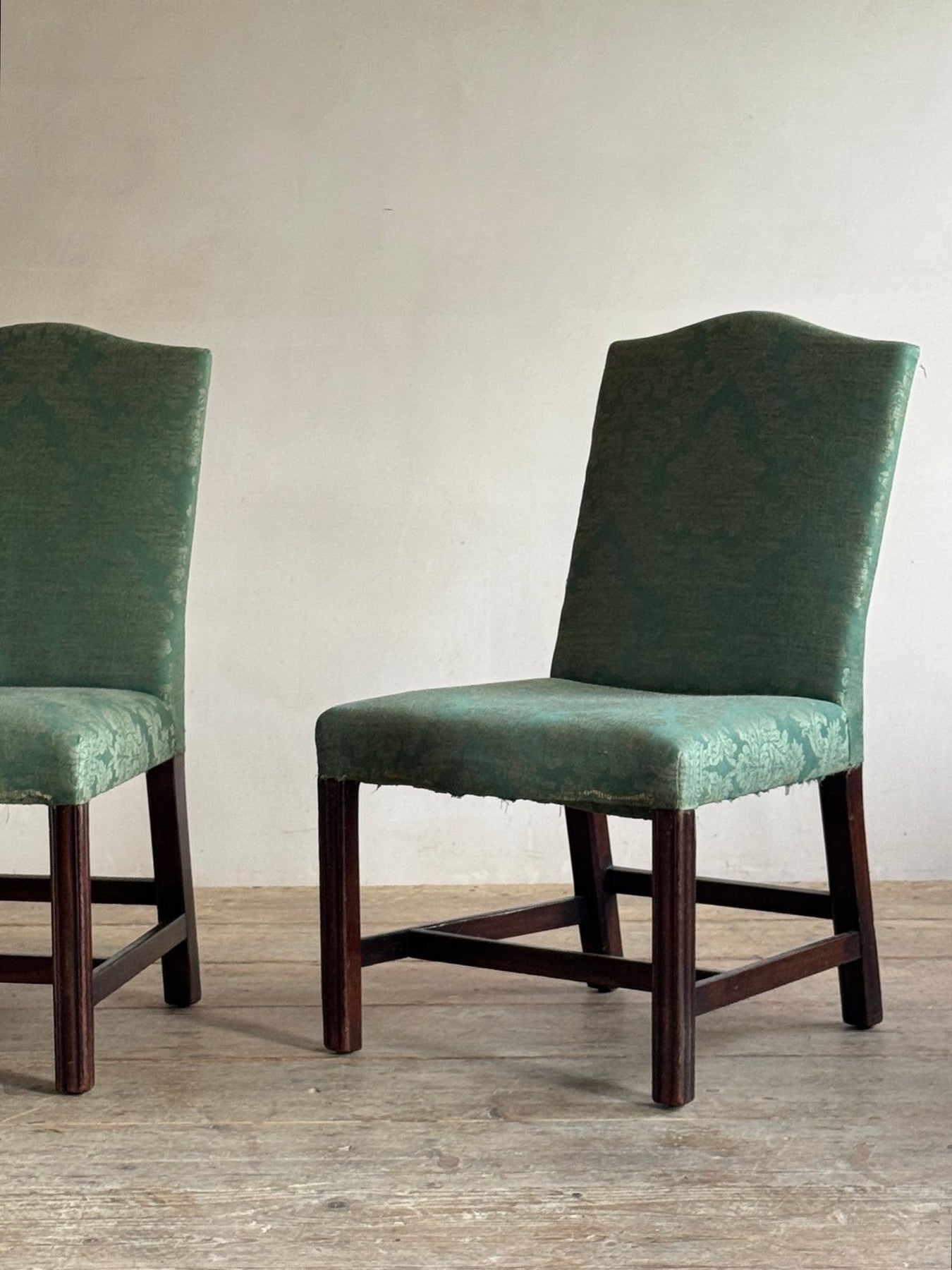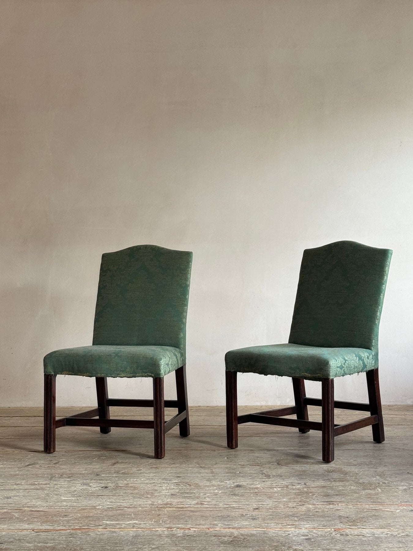 A pair of 18thC mahogany and upholstered side chairs, with a nicely shaped and raked back and moulded square front legs. Often referred to as a Gainsborough type chair. Comfortable and sturdy,  requiring reupholstery.