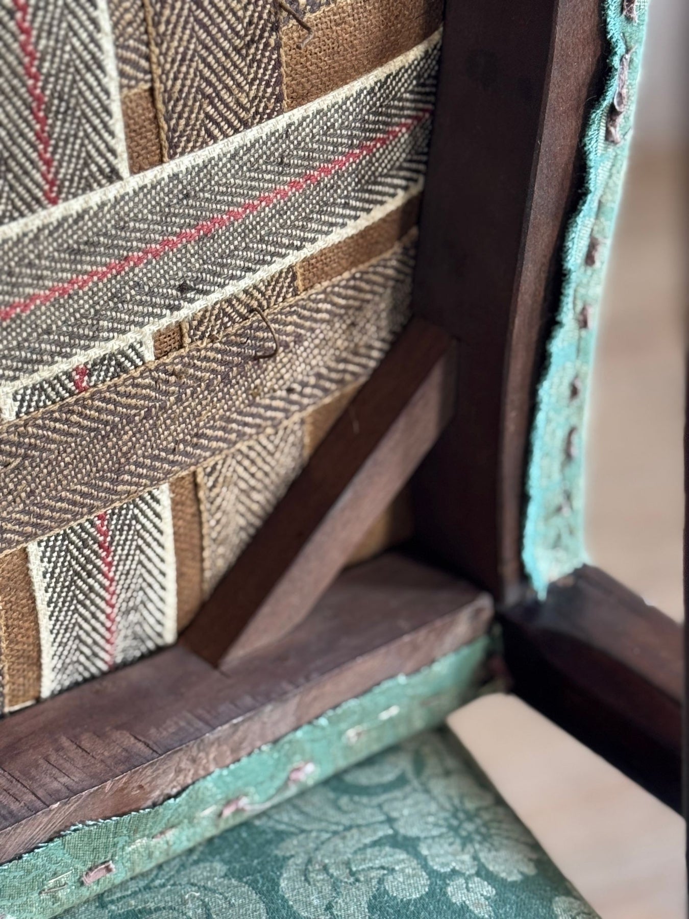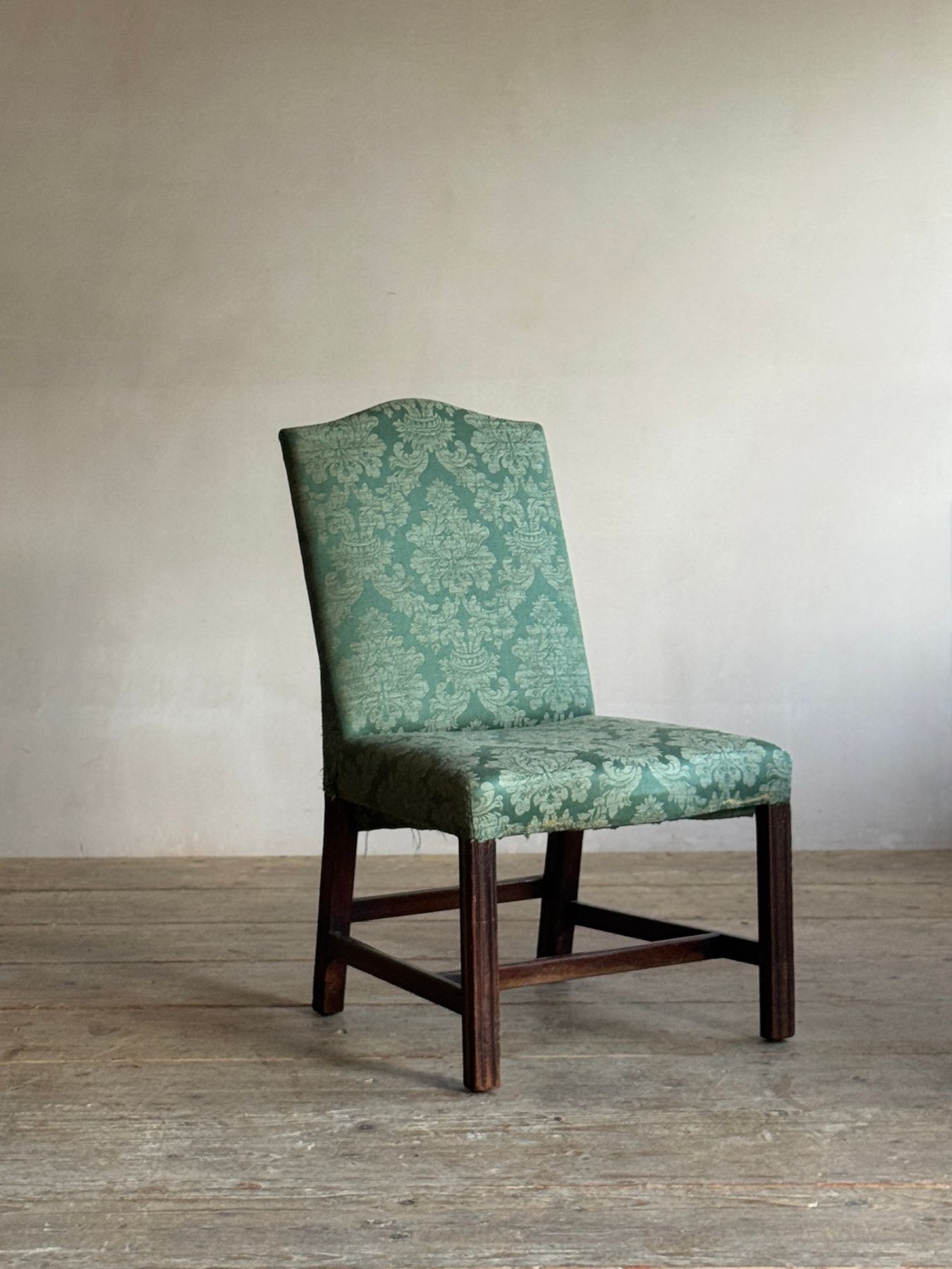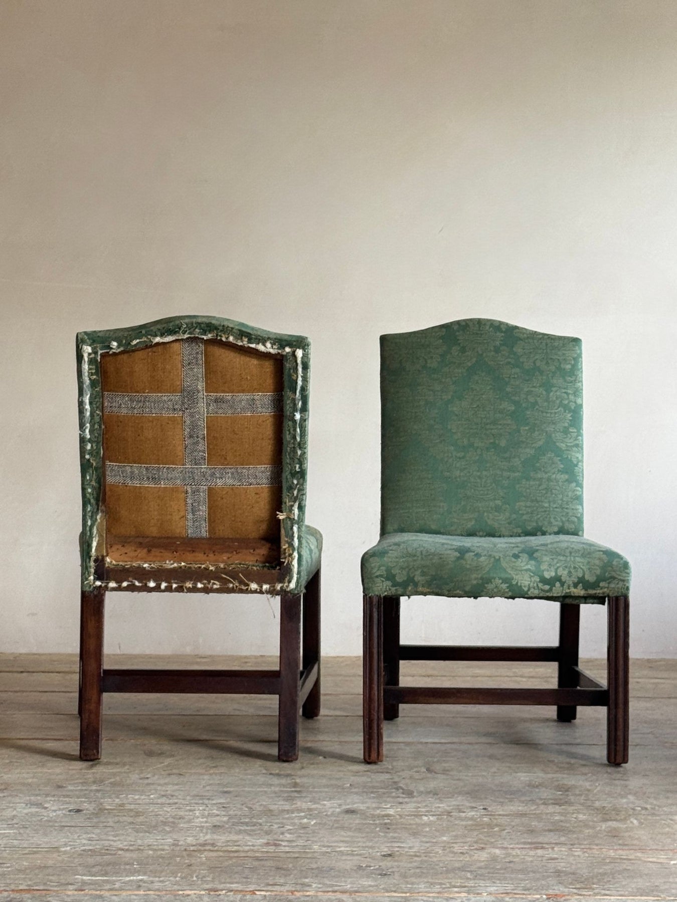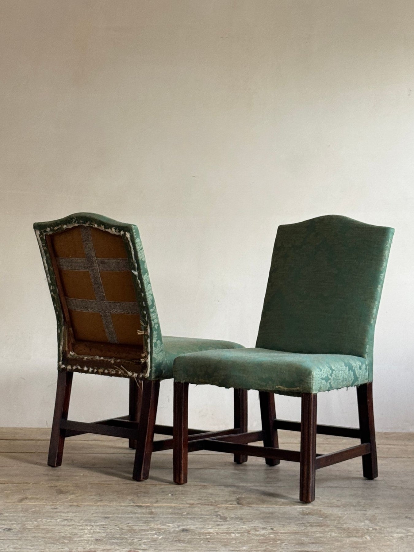 A pair of 18thC mahogany and upholstered side chairs, with a nicely shaped and raked back and moulded square front legs. Often referred to as a Gainsborough type chair. Comfortable and sturdy,  requiring reupholstery.