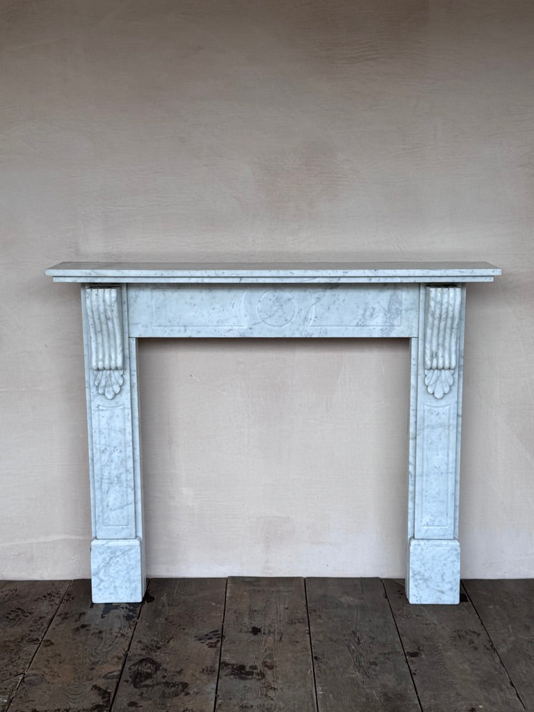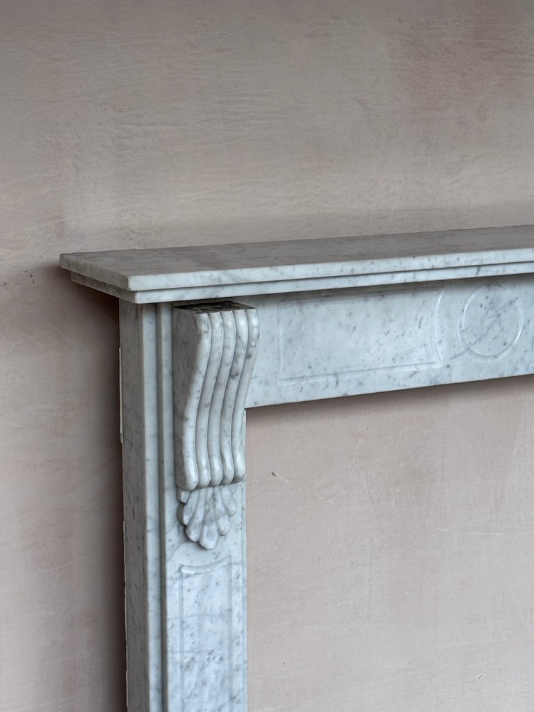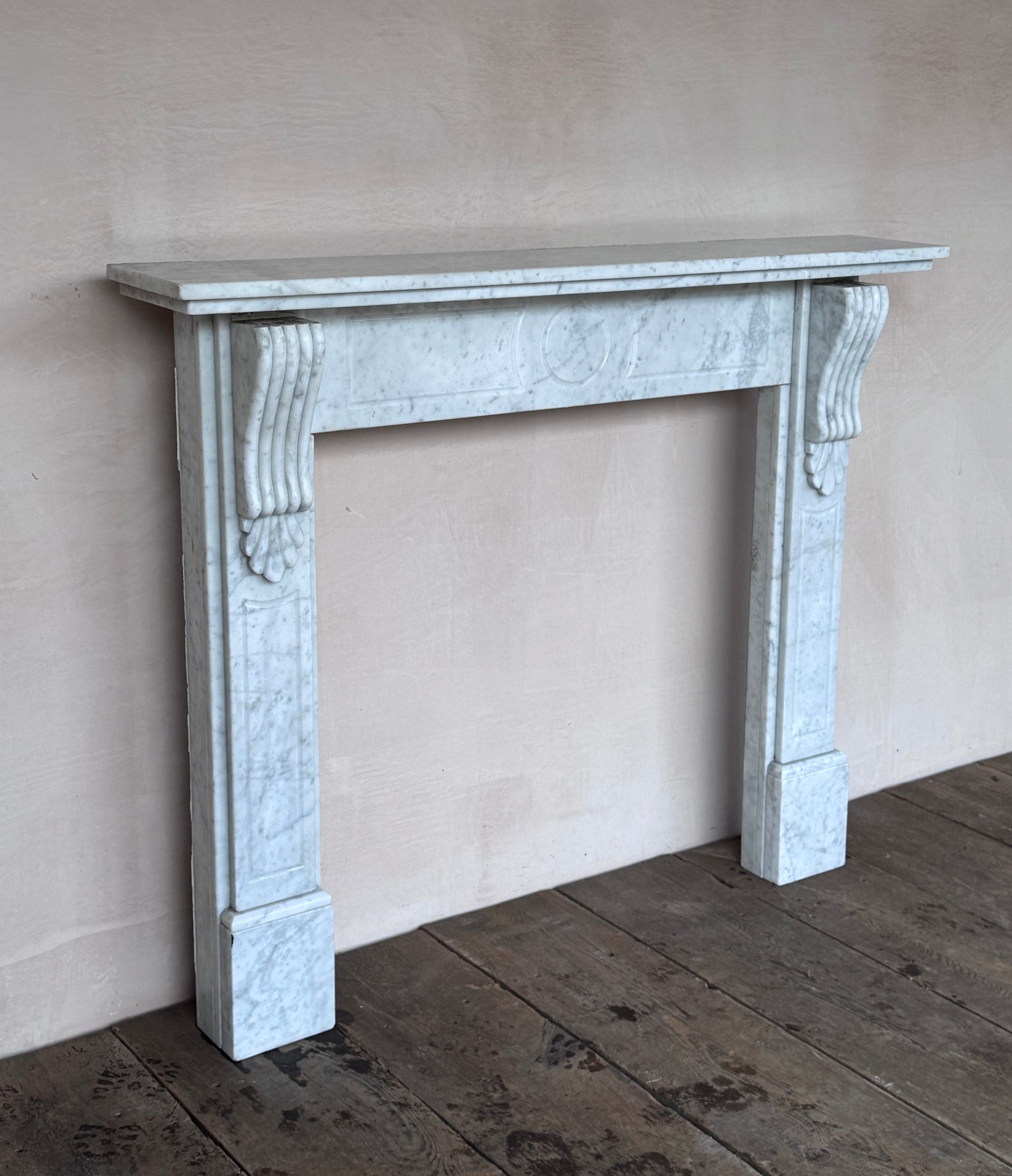 a Carrara marble chimney piece with decorative corbels and carved under mantle.